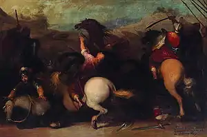 y sucedió, que habiendo comprado un caballero unas batallas suyas, de las que sacaban a vender en Palacio; preguntó dónde vivía el artífice, porque quería otras. Dijéronselo, y fue a buscarle; y habiendo preguntado, si vivía allí uno que pintaba batallas, salió él, y dijo: Señor mío, yo no pinto solo batallas, que también pinto historias, santos, y retratos, aunque sean del demonio; y retrataré a su merced si gustare.[12]