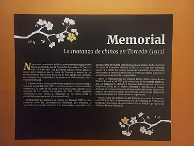 - El Museo Arocena inauguró, ese mismo año, la exposición "Memorial. La matanza de chinos en Torreón 1911".[34] Es un espacio dedicado a la reflexión sobre las condiciones sociopolíticas de la época, con este fin recurre a mostrar fotografías de la época, así como la lista con los nombres de las 303 víctimas.[7]