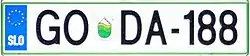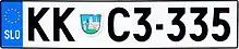 El formato sigue el mismo del de las placas de matrícula de la UE (con dimensiones de 520 mm × 120 mm), añadiendo una franja azul a la izquierda donde se encuentra la bandera de la UE y el código internacional del país, SLO, en blanco.