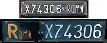 Matrículas militares![]() Matrícula del Esercito Italiano ![]() Matrícula de Marina Militare Los militares tienen matrículas con prefijos EI (Esercito Italiano, Tierra), AM (Aeronautica Militare, Aire) y MM (Marina Militare, Armada), todas en rojo, sus remolques llevan la inscripción "RIMORCHIO". Hay un código como se ha mencionado, pero es pequeño y blanquito. El esquema es EI LL 000. Siendo "EI" el prefijo, "LL" las letras y "0" los números, para evitar confusión con las matrículas civiles a partir de 1994. Entre las letras y los números hay un punto verde. En 1980 el ejército adoptó placas del tamaño de 11x34 cm, pero recientemente se usan las dimensiones de la matrícula civil de 1994 a 1999 para las traseras. Desde 2004, los vehículos militares históricos que no tengan su matrícula inicial, usan el patrón EI VS 000 con "VS" en verde. Hasta 1995 las matrículas del ejército eran EI 000 AA y antes de 1985 era EI 000000 con las mismas dimensiones que las civiles (excepto la frontal, que era más pequeña), por lo que algunas matrículas civiles estaban reservadas para estos (de EI 400000 a EI 450000 eran para el ejército). Sin embargo, el sistema previo a 1979 de números solo sigue usándose en vehículos blindados y tanques.