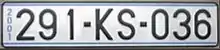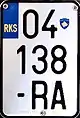 - Las de los ciclomotores y escúteres de hasta 125 cm³ miden 100 × 150 mm y tienen los caracteres distribuidos en tres filas: en la parte superior se encuentra la banda azul con las letras RKS, el código numérico regional y el logotipo del Estado; en el centro, los tres dígitos; y en la parte inferior, un guion y dos letras de serie (que empiezan en "RA").