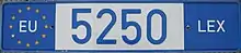 - Las matrículas de los vehículos de la EULEX pueden tener un fondo blanco o negro. En el primer caso, la numeración progresiva va precedida del círculo de las doce estrellas amarillas de la Unión Europea (no siempre presentes y a veces en una franja azul), las letras EU en color blanco, seguidas de un número de 3-4 cifras y de las letras PV (Personal Vehicle) o P (Personnel), también blancas. En el segundo caso, las letras EU de color blanco rodeadas por las doce estrellas amarillas símbolo de la UE dentro de una franja azul preceden a cuatro cifras azules y a las letras LEX en blanco en el centro de otra franja azul situada a la derecha.