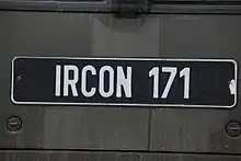- Vehículos del contingente irlandés de la KFOR: los caracteres son de color gris plateado sobre fondo negro; las letras IRCON, que significan Irish Contingent, preceden a una numeración progresiva generalmente de tres cifras.