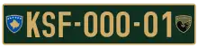 - Los vehículos de la Fuerza de Seguridad de Kosovo tienen asignadas placas con las siglas KSF (iniciales de Kosovo Security Force): el código, que hasta 2013 iba precedido y posteriormente seguido del escudo nacional, va seguido de dos números (el primero de tres dígitos y el segundo, que indica la función del departamento,[6] de dos) y el logotipo del Cuerpo; los caracteres son amarillos sobre un fondo verde oscuro.