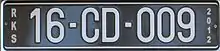 - Vehículos de los Cuerpos Diplomáticos (desde 2008): las letras y los números son blancos sobre fondo negro. El código automovilístico internacional "RKS", con las letras alineadas verticalmente a la izquierda, va seguido de dos cifras (tres hasta 2011) que identifican el país de representación, el código CD y una numeración secuencial que se inicia en 001. En el margen derecho figura el año de matriculación del vehículo, con los dígitos alineados en vertical.