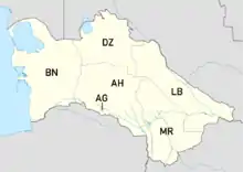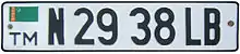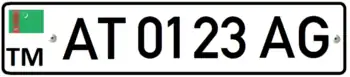 Las placas vehiculares turcomanas tienen caracteres negros con fondo blanco más la sigla TM debajo de su bandera al lado izquierdo. Estas comprenden de una letra, cuatro dígitos separados en dos y dos letras; esta última corresponde el código de la ciudad o provincia donde se registró.