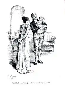 Su felicidad doméstica, que luego encuentra difícil de soportar, es una prefiguración más bien pálida de la que Jane Austen prepara para el resultado de sus dos personajes principales, una vez aclarados los malentendidos que los separan.[117] Porque, justo cuando Emma conoce los defectos de su cuñado,[115] el Sr. Knightley ve lo que la hace mucho mejor que su hermana mayor.[118]