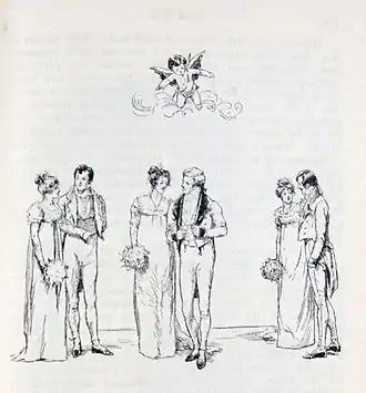 La elección de la heroína es gratuita, nunca dictada por los imperativos económicos,[135] solo por el hecho de que el héroe se hace amable por sus cualidades morales y personales. Equilibrio entre el matrimonio basado únicamente en la atracción sexual, el matrimonio feliz se basa en el afecto y la estima, o la gratitud.[136] Si los personajes tienen un amor profundo, como Elinor Dashwood, Fanny Price, Anne Elliot, incluso romántica, la de Brandon para Marianne, Darcy para Elizabeth, no tiene nada «amor a primera vista» o «amor loco». Edmund Bertram siempre ha considerado a Fanny como una hermana pequeña y luego una confidente de su corazón roto; Henry Tilney simplemente se conmovió por la admiración ingenua y juvenil de Catherine Morland;[nota 11] Fueron sus celos con Frank Churchill los que hicieron que Knightley comprendiera sus verdaderos sentimientos hacia Emma, y la mirada de admiración del Sr. Elliot hacia Lyme Regis, quien revivió el amor de Wentworth por Anne.