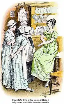 La condición social de las mujeres dependía tanto del matrimonio, que cuando obtuvieron el derecho al voto en las elecciones legislativas de 1918, se propondrá excluir a las chicas mayores porque «no habían logrado complacer o atraer compañeros».[8] El estado de soltera es por lo tanto inferior al de una mujer casada, ya que Lydia,(16 años) recién casada con George Wickham, que se pone a la derecha de su madre, lugar habitual de su hermana mayor, la señorita Bennet (23 años), exclamando con una mezcla de ostentación y ansiedad: «¡Oh, Jane! Ahora tomo tu lugar, y me lo tienes que ceder, ¡porque estoy casada!».[13])> Del mismo modo, al final de Persuasion, Mary Musgrove, aunque «honrada de tener una hermana casada, [...] bien puede tener que sufrir, cuando se reúnan, por ver a Anne Elliot restaurada en sus derechos relacionados con la edad».[14]