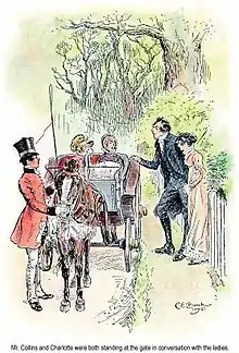 Jane Austen incluso sugiere, en los márgenes de la novela, un futuro más «interesante» para Charlotte. Como una sabia chica comerciante —ciertamente ennoblecida—, comenzó su ascenso social casándose con un pastor. Y dado que este último está seguro, debido al fideicomiso, de heredar el patrimonio de Longbourn a la muerte de Bennet, algún día se beneficiará de una promoción social comparable, aunque un paso más bajo, al de Elizabeth.[88]