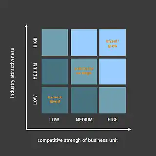 En primer lugar, la matriz tal y como la describe actualmente McKinsey en McKinsey Quarterly (enlace roto disponible en Internet Archive; véase el historial, la primera versión y la última).. Se trata de un modelo simplificado del original. Existen tres áreas de distintos colores. Las áreas de negocio o UEA con mayor fortaleza y situadas en sectores más atractivos invest/grow, requieren enfocar la mayor inversión posible para alcanzar un rápido crecimiento. Las áreas de negocio o UEA con menor fortaleza y en sectores menos rentables harvest/divest, aconsejan su venta o desinversiones progresivas. En un término medio selectivity/earnings se hallan las UEA en las que merece la pena invertir, aunque de manera selectiva.