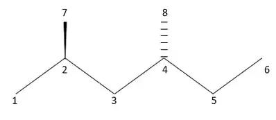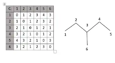 - Crear un árbol etiquetado que represente su fórmula esqueletal de una molécula en función de su matriz de distancias. La matriz de distancias es imperativa en esta aplicación ya que moléculas similares pueden tener varios árboles etiquetados diferentes asociados a su fórmula esqueletal. La estructura del árbol etiquetado asociado a la fórmula esqueletal del hexano () que se crea en función de la matriz de distancia en el ejemplo, tiene diferentes variantes de su fórmula esqueletal que afectan tanto a la matriz de distancia como al árbol etiquetado.Representación del árbol etiquetado de la fórmula esqueletal de basada en su matriz de distancias.