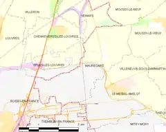 ![]() El Aeropuerto París-CDG ocupa buena parte de la comuna. La aèrogare 1 (edificio en forma de abanico) y parte de dos pistas se encuentran en ella. En núcleo de Mauregard puede verse al noreste del aeropuerto.[3] | ||