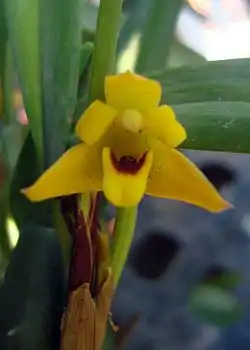 Flores de unos 2 cm con variaciones de color que van desde el amarillo pálido hasta el rojo intenso, con una mancha de apariencia húmeda de color rojo o vino en el interior del labelo. Tiene pseudobulbos ovoides, de unos 2 cm de alto unidos por un rizoma largo que al cabo del tiempo hace que la planta cuelgue. Presenta una hoja única de hasta 25 cm de largo, flexible, verde brillante, e inflorescencias individuales en la base de los brotes más recientes, sus flores pueden estar presentes durante todo el año pero principalmente de invierno a primavera.