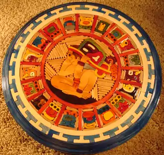 Otro elemento no maya es la imagen frecuentemente usada por los mayanistas de la mal denominada piedra calendárica azteca, un monumento que muestra a Tonatiuh o a Tlaltecuhtli, ambos personajes del panteón mexica.