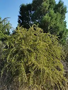 Tiene un tamaño máximo de unos dos metros. Arbusto espinoso de hojas coriáceas, de peciolo corto, oblongas o elípticas, dispuestas de forma alterna o fasciculada. Flores actinomorfas y hermafroditas, de color blanco o verdoso, de 4-6 mm de diámetro. Cáliz de 5 sépalos, soldados a la base. Corola de 5 pétalos. Androceo con 5 estambres, alternipétalos. Ovario bilocular o inocular. El fruto tiene forma elipsoidal, de unos 5 mm, cápsula, que produce semillas de color paro o rojizo, de unos 2-3 mm.