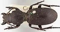 Su longitud es 18–26 mm, ancho pronotal de 5,4–7,53 mm y elitral de 6,13–8,56 mm. El color del cuerpo varía de brillante a negro mate, excepto la coxa y el tarso que van de marrón rojizo a negro.[2]