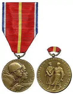 En el reverso, en la parte central, hay figuras de dos soldados caminando dándose la mano. El primer soldado con uniforme del ejército checoslovaco está armado con un subfusil soviético PPSh-41 colgada del hombro, el segundo soldado, armado con un subfusil, lleva el uniforme del Ejército Rojo. A lo largo de casi todo el borde de la medalla, hay una inscripción «SE SOVETSKI SVAZEM NA VECNE CASY» (con la Unión Soviética para siempre).[2]