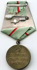 Inicialmente, la cinta se instaló de 20 mm de ancho, de color verde claro con rayas estrechas a lo largo de los bordes de 2 mm de ancho cada una: rojo para la medalla de 1.er grado, y azul para la medalla de 2.do grado.[12] Por decreto del 19 de junio de 1943, se instaló una nueva cinta de 24 mm de ancho, verde claro con una raya longitudinal en el medio de 2 mm de ancho: rojo para la medalla de 1er grado, y azul para la medalla de 2.do grado.[13]