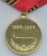 El reverso original de la medalla, según lo dispuesto por el Decreto del Presidente de la Federación de Rusia de 6 de marzo de 1995 N.º 243, tenía en el centro, grabados en relieve en letras grandes los años «1896-1996» y ramas de roble y laurel en la parte inferior después de la circunferencia inferior de la medalla.[2] Algunos fabricantes fabricaron una variante de la medalla con una inscripción más pequeña (1896-1996) y agregaron una «N» en relieve y una línea para el número de serie del premio. Se otorgaron más de 2,5 millones de condecoraciones de esta versión.