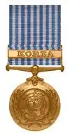Es una medalla circular, realizada en bronce. Al su anverso aparece reproducido, como es habitual el emblema de la organización; en su reverso figura grabada la inscripción "Por el servicio en defensa de los principios de la Carta de las Naciones Unidas". Se porta pendiente de una cinta con franjas alternas de color azul celeste, propio de la organización, y blancas, el color predominante en la bandera de Corea del Sur.