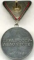 El reverso de la medalla tiene la inscripción ТРУД В СССР – ДЕЛО ЧЕСТИ ("El trabajo en la U.R.S.S. es una Cuestión de Honor").