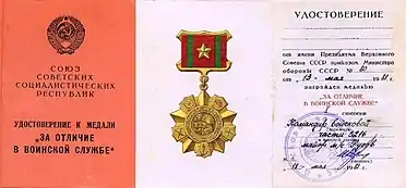 La Medalla Medalla por servicio militar distinguido fue establecida el 28 de octubre de 1974 por Decreto del Presídium del Sóviet Supremo de la Unión Soviética.[1] Su estatuto fue posteriormente enmendado por el Decreto del Presídium del Sóviet Supremo N.º 2523-X el 18 de julio de 1980.[2]