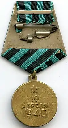 El reverso muestra la fecha en relieve en tres filas «10 de abril de 1945» (en ruso: «10 АПРЕЛЯ 1945») fecha de la liberación de la ciudad. Debajo de una estrella lisa de cinco puntas en relieve.[1]