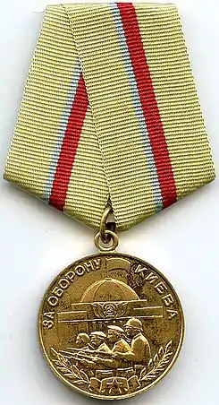 La Medalla por la Defensa de Kiev (en ruso, Медаль За оборону Киева, romanizado: Za oboronu Kieva) es una medalla de campaña de la Unión Soviética establecida el 21 de junio de 1961 por decreto del Presídium del Sóviet Supremo de la URSS,[1] para recompensar a los participantes en la defensa de Kiev (1941) contra las fuerzas armadas de la Alemania nazi. El estatuto de la medalla fue enmendado el 18 de julio de 1980 por decreto del Presídium del Sóviet Supremo de la URSS N.º 2523-X.[2]