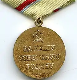 En el reverso, cerca de la parte superior, la imagen en relieve de la hoz y el martillo, debajo de la imagen, la inscripción en relieve en tres filas «POR NUESTRA PATRIA SOVIÉTICA» (en ruso: «ЗА НАШУ СОВЕТСКУЮ РОДИНУ»).[1]