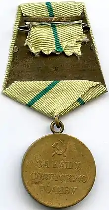 La medalla está conectada con un ojal y un anillo a un bloque pentagonal cubierto con una cinta de muaré de seda de 24 mm de ancho. Inicialmente, la cinta se instaló en rojo con franjas plateadas a lo largo de los bordes, cada una de 4 mm de ancho. Por decreto del 19 de junio de 1943, se instaló una nueva cinta de color oliva con una franja verde longitudinal en el medio de 2 mm de ancho. [1]
