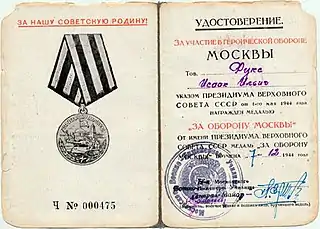 Otorgada por | Participar en la defensa de Moscú (1941-1942) durante al menos un mes | |