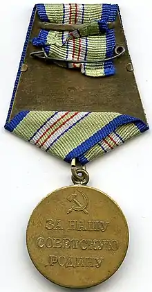 En el reverso cerca de la parte superior, la imagen en relieve de la hoz y el martillo, debajo de la imagen, la inscripción en relieve en tres filas «POR NUESTRA PATRIA SOVIÉTICA» (en ruso, «ЗА НАШУ СОВЕТСКУЮ РОДИНУ»).[1]