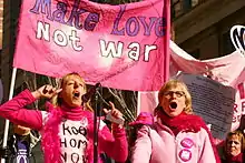 En 2002 fue cofundadora del grupo feminista contra la guerra Code Pink: Mujeres por la Paz y miembro de la organización Unidos por la Paz y la Justicia enfrentándose a la administración de George Bush, reivindicando la resolución de conflictos sin la utilización de las armas y denunciando el peso de la industria armamentística en las decisiones políticas del Congreso de Estados Unidos y de la presidencia del país en detrimento de los propios intereses de la ciudadanía estadounidense.[8]