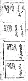 Un cúmulo de papeles hallado en el este de Mongolia hacia 1920, es un registro de una costumbre antigua de comer trozos de papel con textos impresos, para prevenir o curar enfermedades. En pequeños trozos de papel se imprimen encantamientos en tibetano, junto con instrucciones de uso en mongol. Aparentemente esta práctica era parte de una medicina tradicional lama.[2]