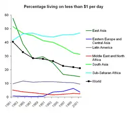 - En 2001, 1 100 millones de personas tenían niveles de consumo por debajo de 1 dólar diario y 2 700 mil millones vivían con menos de $2 al día.