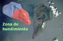 Zona aprox. de la Erupción (Zona Roja) y Zona del Hundimiento (Línea Roja)