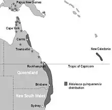 Melaleuca quinquenervia crece en las llanuras inundadas estacionalmente y ciénagas de la costa este de Australia hacia el sur hasta la bahía de Botany en Sídney.[3] Es un componente de la sabana del oeste de Nueva Caledonia, como árboles dispersos que salpican el hábitat de pastizales. Su difusión a través de este paisaje podría haber sido facilitada por los fuegos provocados por los humanos.[4] En Australia, es el tercer género de plantas más diverso con hasta 250 especies.[5] Las principales amenazas para la M. quinquenervia son las urbanizaciones, carreteras, y las plantaciones de caña de azúcar y plantaciones de pino. En Australia no están protegidos en reservas, ya que la mayoría de sus bosques se encuentran en propiedad privada, donde sigue actualmente.[6]