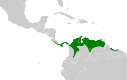Se encuentra desde el Sur de Costa Rica hasta Venezuela y las Guyanas. En Colombia se encuentra desde Riohacha-Guajira hacia el Oriente, el Golfo de Urabá y en el alto valle del río Sinú hasta la base oriental de la Sierra Nevada de Santa Marta, en el sur hasta el valle del río Magdalena, en el oriente de los Andes se encuentra en Norte de Santander y oriente de Vichada.