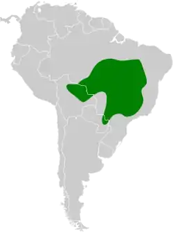 Se distribuye desde el noreste de Brasil, por el interior hasta São Paulo y Mato Grosso do Sul, este de Bolivia y extremo noreste de Paraguay.[3]