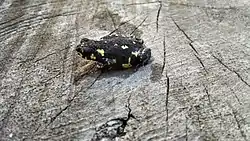 Es un anfibio mayormente negro, con un fino salpicado de color amarillo y rojo intenso (dando un aspecto similar a un reticulado) compuesto por manchitas pequeñas; dorsalmente puede variar en su densidad, pero ventralmente es siempre abundante, incluso las máculas pueden allí llegar a tocarse, pero nunca se presentan de mayor tamaño, aunque sí exhibe un par de manchas más grandes (en algunos ejemplares estas son muy pequeñas) que cubren las regiones escapulares, de color rojo, aunque también pueden ser naranjas o amarillas.