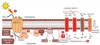 En el caso de los vertebrados, los fotorreceptores ciliares activan la proteína G trimérica transducina (Gt) que actúa sobre la enzima fosfodiesterasa (PDE). Esta enzima se encarga de hidrolizar el guanosín monofosfato cíclico (GMPc) cuya concentración citosólica disminuye. Como consecuencia, se produce el cierre de los canales iónicos de Na+ que genera una hiperpolarización de la membrana plasmática.[18]