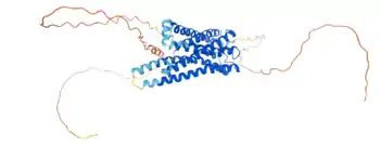 Su estructura secundaria contiene una larga cola citoplasmática que presenta múltiples sitios putativos de fosforilación, lo que indica una regulación delicada de la función proteína[16]