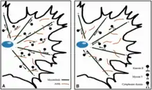 Los melanosomas que se encuentran en ciertas especies de peces contienen pigmentos que controlan el color de las escamas de los peces. Los motores moleculares, cuando se les indique, transportarán los melanosomas que contienen pigmentos a la periferia de la célula o los concentrarán en el centro.[10] La proteína motora dineína es responsable de concentrar los melanosomas hacia el centro de la célula, o el "extremo negativo" de los microtúbulos . Por el contrario, la proteína kinesina es responsable de dispersar los melanosomas hacia la periferia de la célula y son motores dirigidos a los extremos. Debido a que los extremos positivos de los microtúbulos están orientados hacia la periferia, la kinesina transportará los melanosomas a la periferia. La dispersión de los melanosomas hacia la periferia hace que la célula parezca más oscura; concentrar los melanosomas hacia el centro hará que la célula tenga un color más claro. Así es como funciona un sistema fotoprotector para los peces a nivel molecular.[10]