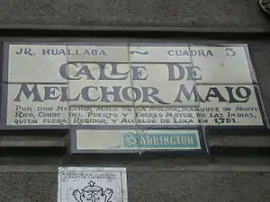 Hasta 1862 cada cuadra de las vías del Centro Histórico de Lima recibía un nombre diferente. Así, la cuadra 3 del Jirón Huallaga se llamaba Melchor Malo en homenaje a esta prominente familia, que vivió allí.[2]