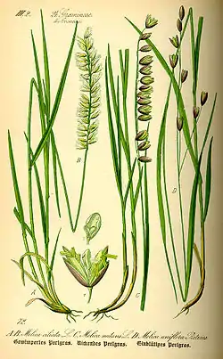 Melica es un género de plantas herbáceas perteneciente a la familia de las poáceas.[1] Es originaria del norte templado, Sudáfrica y Sudamérica.