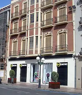 La Casa de Manuel Buxedas Aupi (1910-1911), la Casa de Antonio Baena Gómez (1910), Muebles La Reconquista (Circa 1910), la desaparecida Casa Basilio Paraíso (1910-1912), la Casa de José Guardiola (1910), el Casino Español (1911), General Prim, 22, Sor Alegría, 6 (1911), la Casa de José Mascaró Rafols y Julia Iturralde (1911) la Casa de Baños (1912-1913), la Antigua redacción de El Telegrama del Rif (1912-1913), la Cámara Oficial de Comercio, Industria y Navegación (1913-1914) con el trío del Antiguo Economato Militar, denominado popularmente Casa Tortosa (1914-1915), los Antiguos Grandes Almacenes la Reconquista (1915-1917) y la Casa David J. Melul (1915-1917), la flor y nata del modernismo floral lo utiliza en la Casa de J. Barciela, la Casa Meliveo (1920), la Casa de José Zea y Manuel Alvadalejo, los componentes de la Manzana de la Concordia, la Casa de Miguel Gómez Morales (1927-1928), la Casa de Lázaro Torres (1928-1929), la cercana Casa de Juan Montes Hoyo, denominada popularmente Casa La Pilarica (1928-1929), Casa de la viuda de Antonio Ibancos, el Antiguo Banco de Bilbao, la Casa de José Guardiola, la Casa de Vicente Martínez (1931-1932), la Casa de Juan Florido Santos y Lázaro Torres García (1928-1929), la Casa de José García Álvaro, más conocida como Casa El Acueducto (1928-1930), los Almacenes Juan Montes Hoyo el Teatro Kursaal (1930), el Teatro-Cine Perelló (1926-1932)