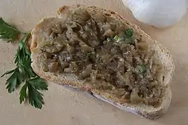 El malidzano es un plato típico macedonio, que se compone de puré de berenjena, queso sirene (un queso muy parecido al queso feta típico de Bulgaria y Macedonia del Norte ), frutos secos y especias. Se sirve como aperitivo sobre rebanadas de pan.