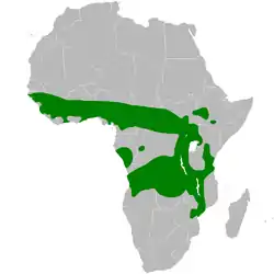 Se encuentra en gran parte del África subsahariana, salvo su cono sur. Su hábitats son la sabana húmeda y el matorral tropical.