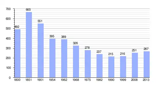 Los datos demográficos contemplados en este gráfico de la comuna de Membrolles[4] se han cogido de 1800 a 1999 de la página francesa EHESS/Cassini, y los demás datos de la página del INSEE.[5]